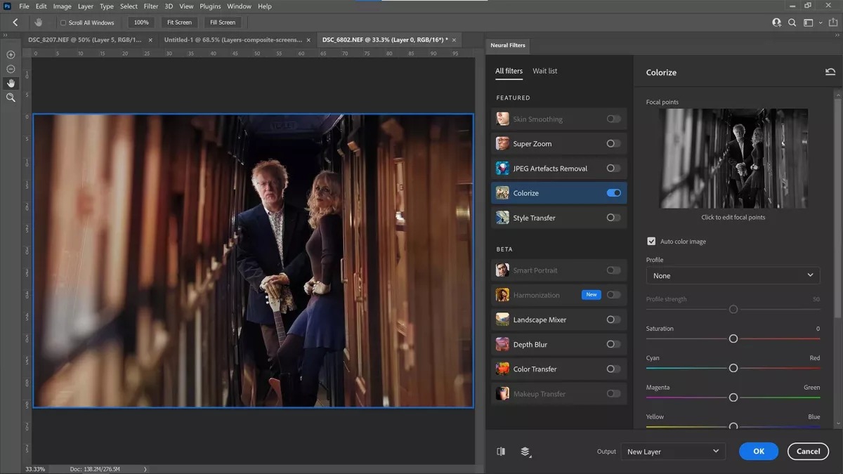 Neural Filters มีการเพิ่มเครื่องมือใหม่ที่เรียกว่า "Harmonization" เข้ามา ความยากในการซ้อนภาพคือ การทำให้วัตถุที่เรานำมาซ้อนบนพื้นหลังมีค่าแสงที่สอดคล้องสัมพันธ์กัน หากปรับไม่ดีภาพจะดูลอย ดูปลอมอย่างชัดเจน ซึ่งการจะทำให้เนียนนั้นไม่ใช่เรื่องง่าย เป็นศิลปะขั้นสูงที่ต้องอาศัยประสบการณ์ แต่ด้วย Harmonization มันจะสามารถปรับแสงให้เราอัตโนมัติออกมาเนียนอย่างง่ายดาย